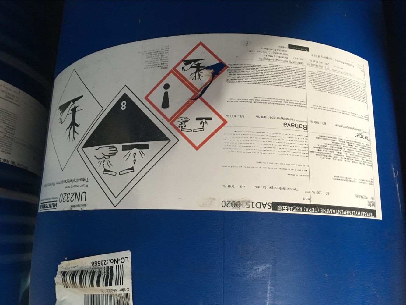 產(chǎn)品名 | 四乙烯五胺 | 英文名 | Tetraethylenepentamine(TEPA) | 產(chǎn)品外觀 | 微黃液體 | 包裝規(guī)格 | 205kg/桶(塑料桶) | 產(chǎn)地 | 美國、沙特 | 供應商 | 亨斯邁 | 應用 | 固化劑、聚酰胺樹脂等 | 危險類別 | 8類危化品 | CAS NO | 112-57-2 |